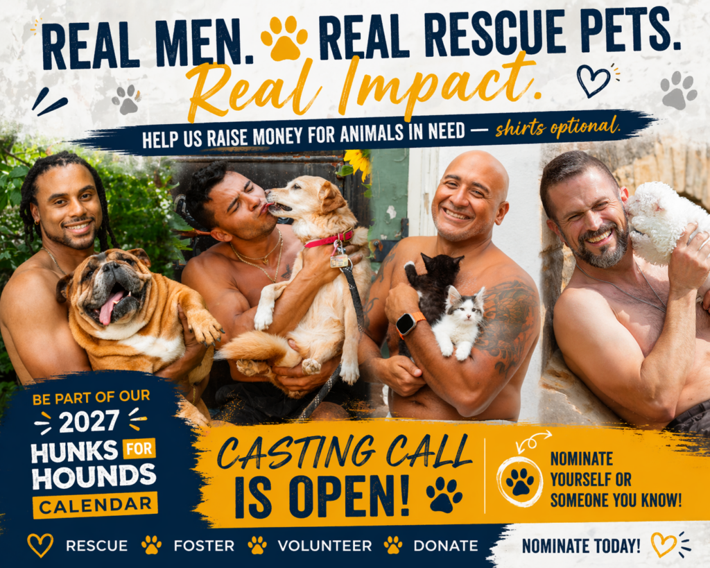 We’re looking for animal loving men with big hearts (and maybe decent biceps) to help us raise money for pets in need. Shirts are optional. Kindness is required. All body types welcome. All rescue pets adored. If you want to help save animals — and have some fun doing it — we’d love to meet you. Every year, our Hunks for Hounds calendar helps fund lifesaving vet care for animals.